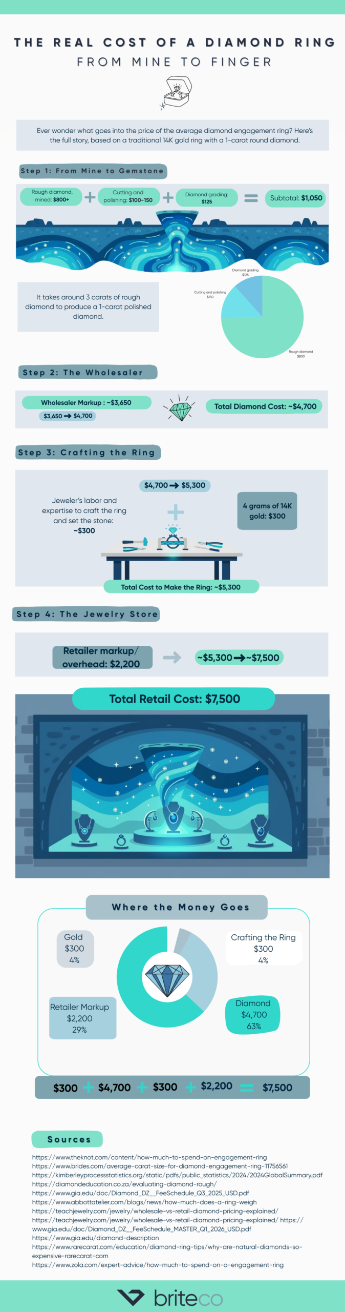 At BriteCo, we specialize in insuring jewelry, but our team got curious about exactly what goes into the value of the engagement rings we insure. That’s why we put together this infographic, digging into all of the costs that make up the final price you see at the jewelry store.